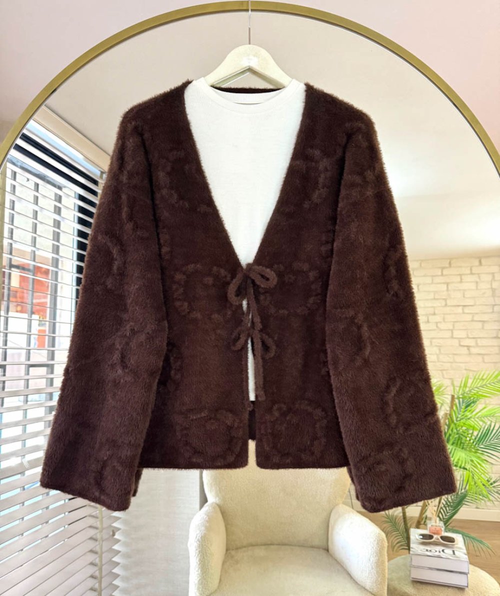 Bağcıklı Sakallı Kısa Triko Hırka Kahverengi