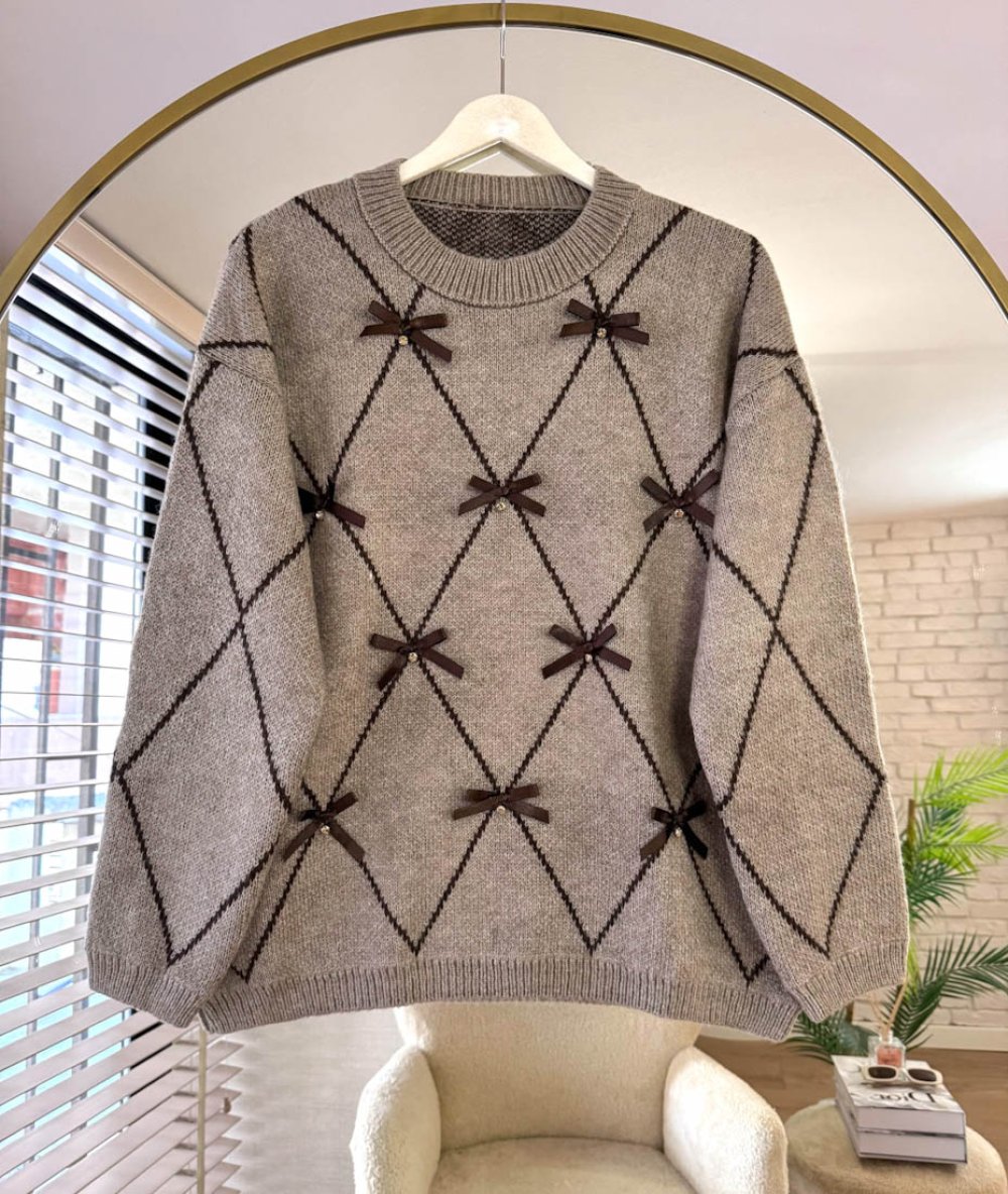 Baklava Desenli Fiyonklu Kazak Kum Beji