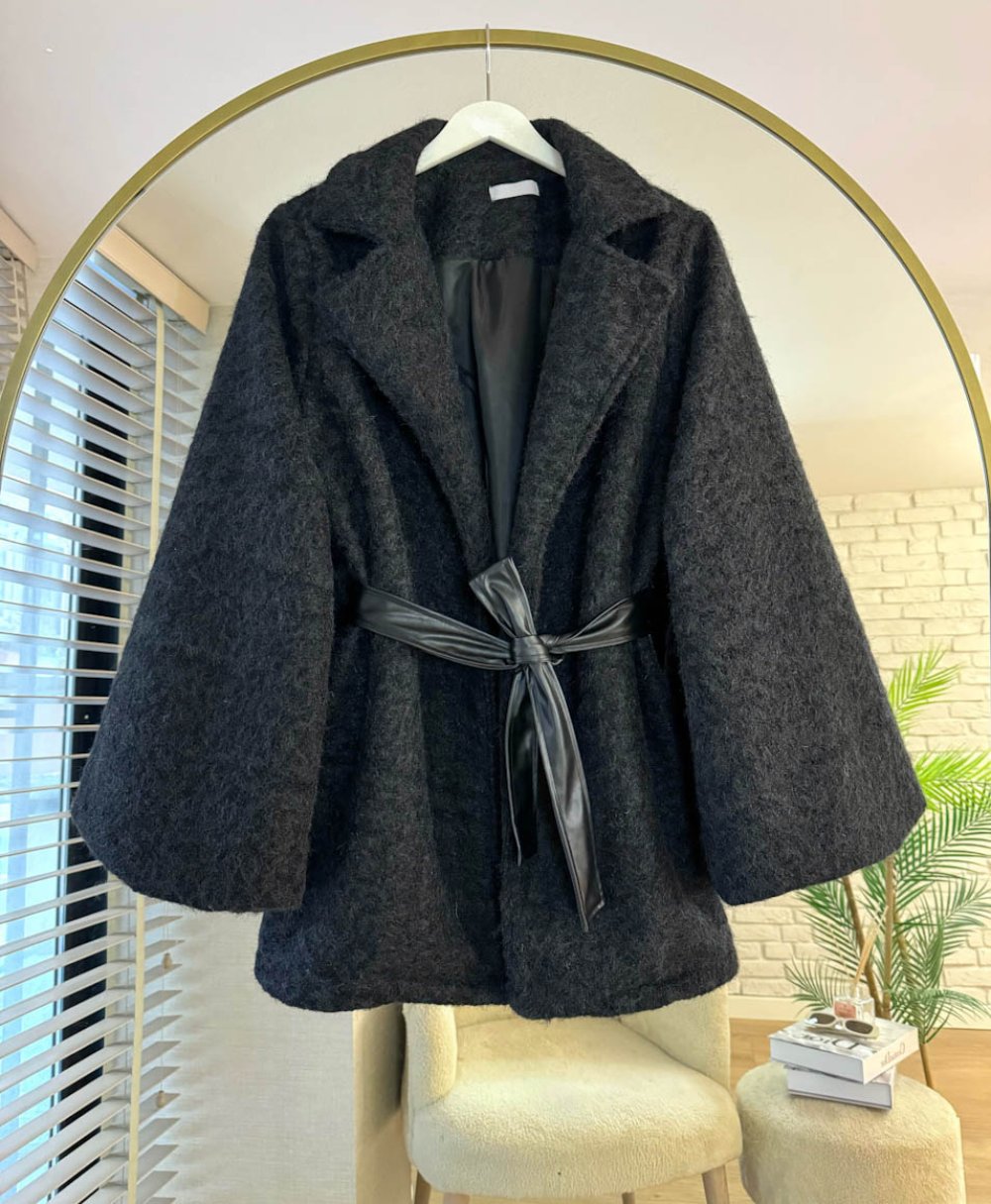 Balon Kol Deri Kuşaklı Ceket Siyah