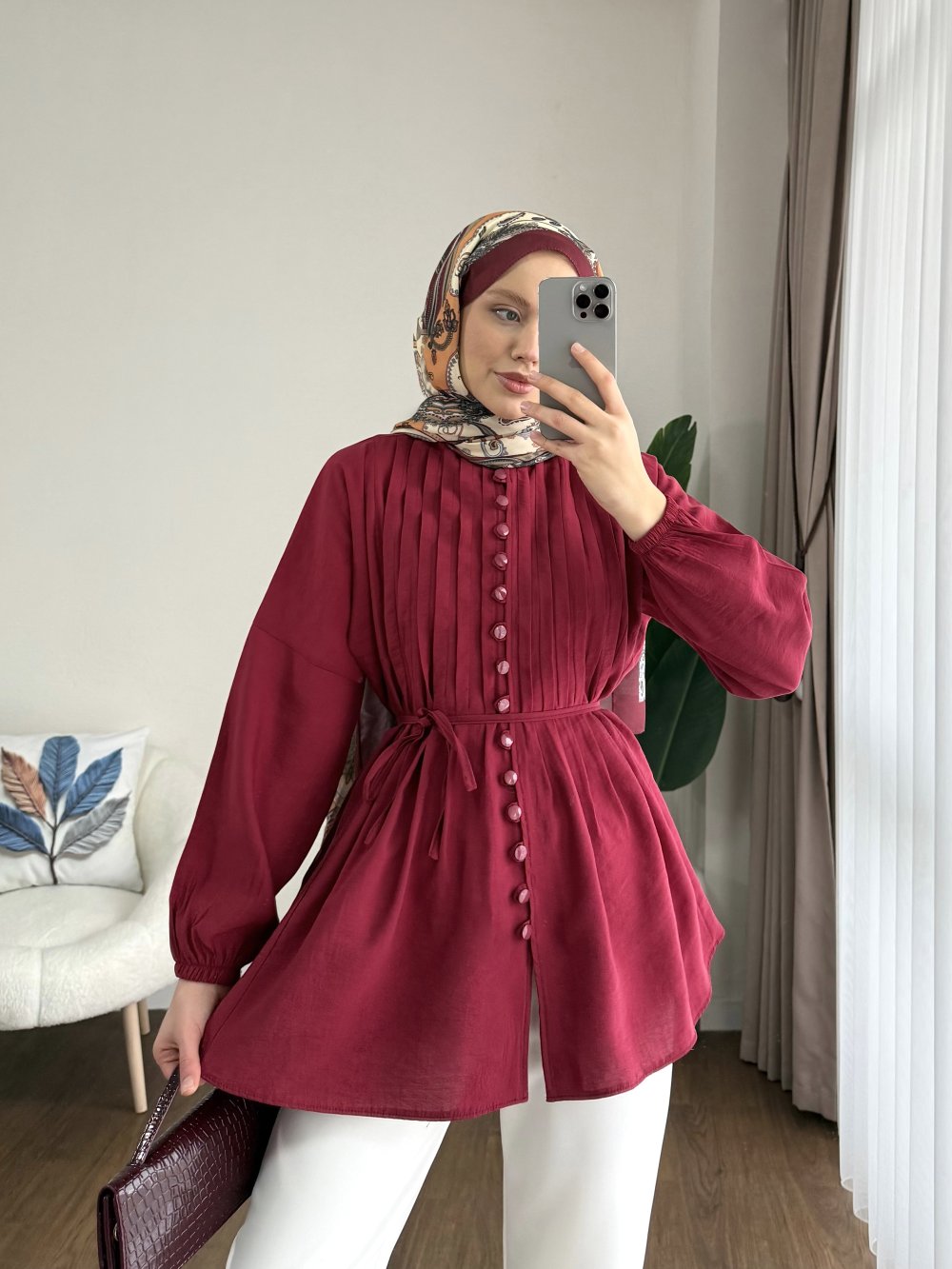 Brit Düğmeli Nervürlü Gömlek Bordo