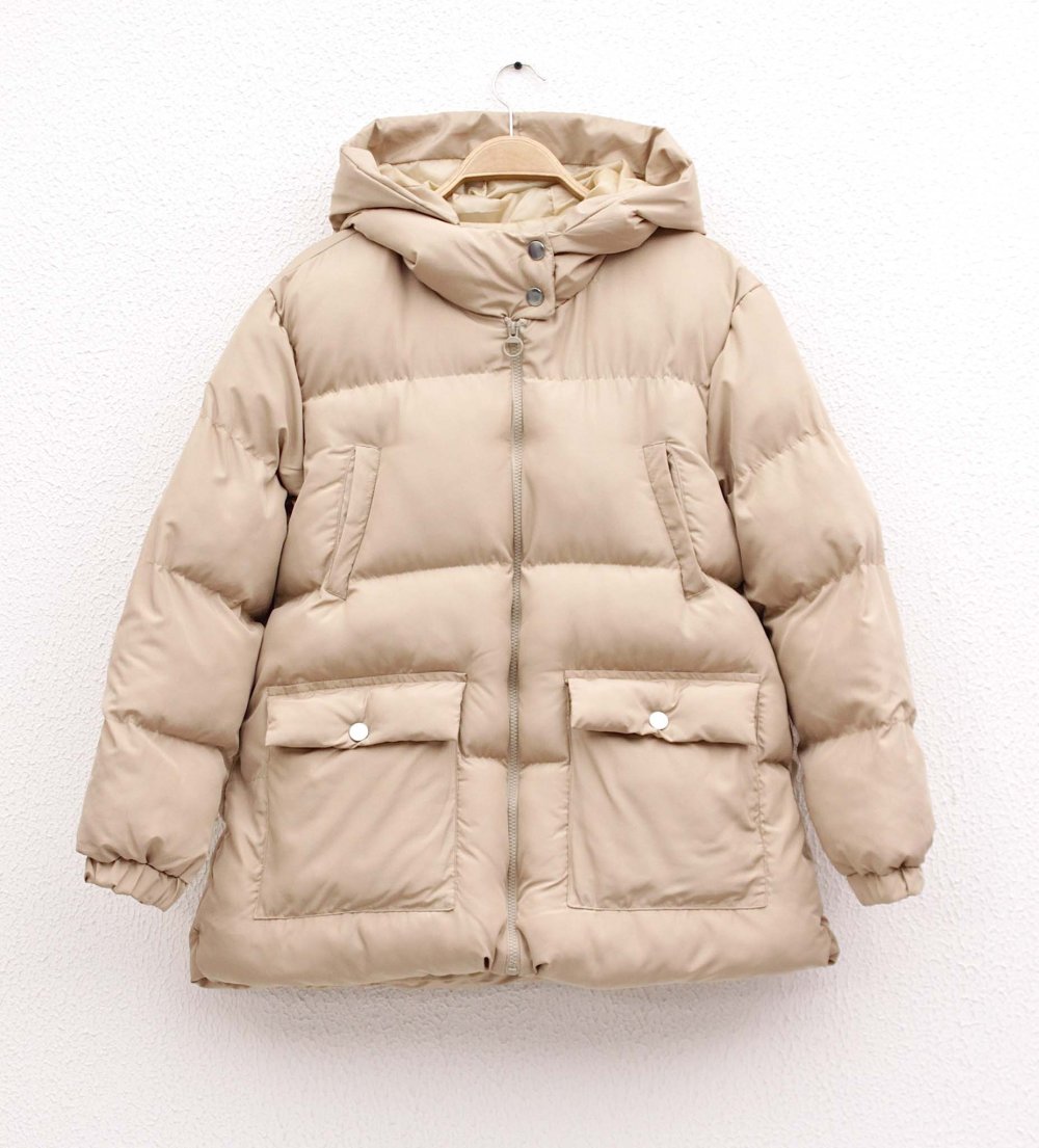 Cep Detaylı Kapüşonlu Şişme Mont Bej