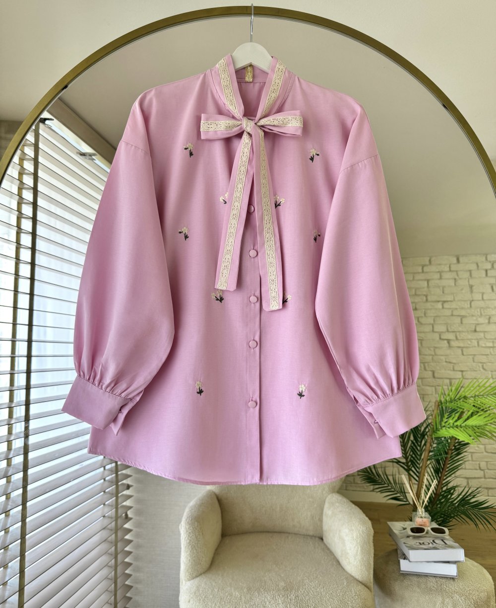 Çiçek Nakışlı Yakası Bağcıklı Gömlek Pembe