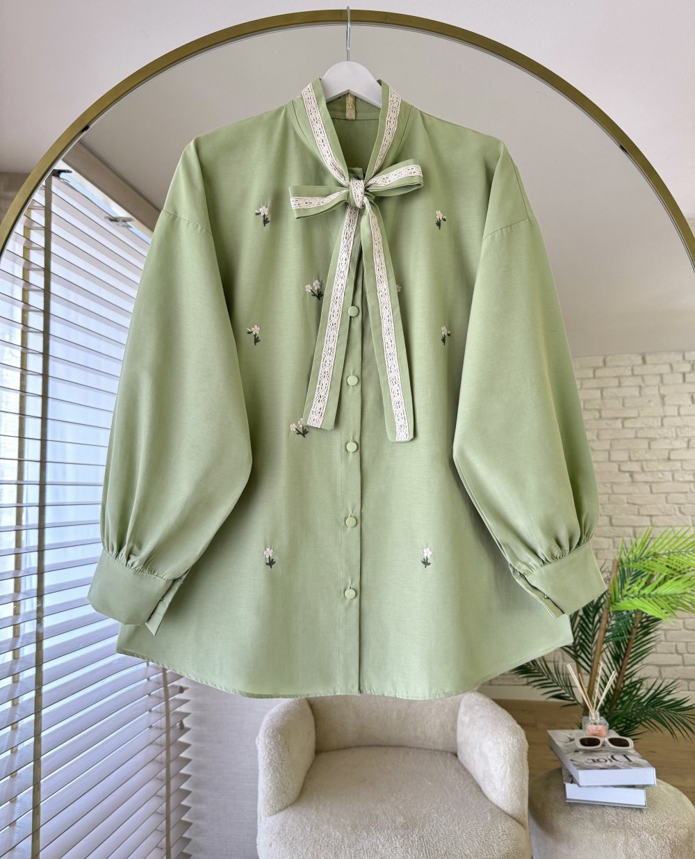 Çiçek Nakışlı Yakası Bağcıklı Gömlek Yeşil
