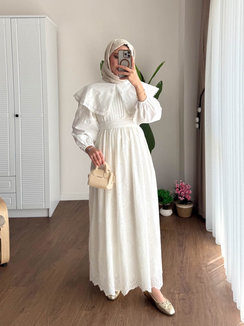 Çift Yaka Brode Elbise Beyaz