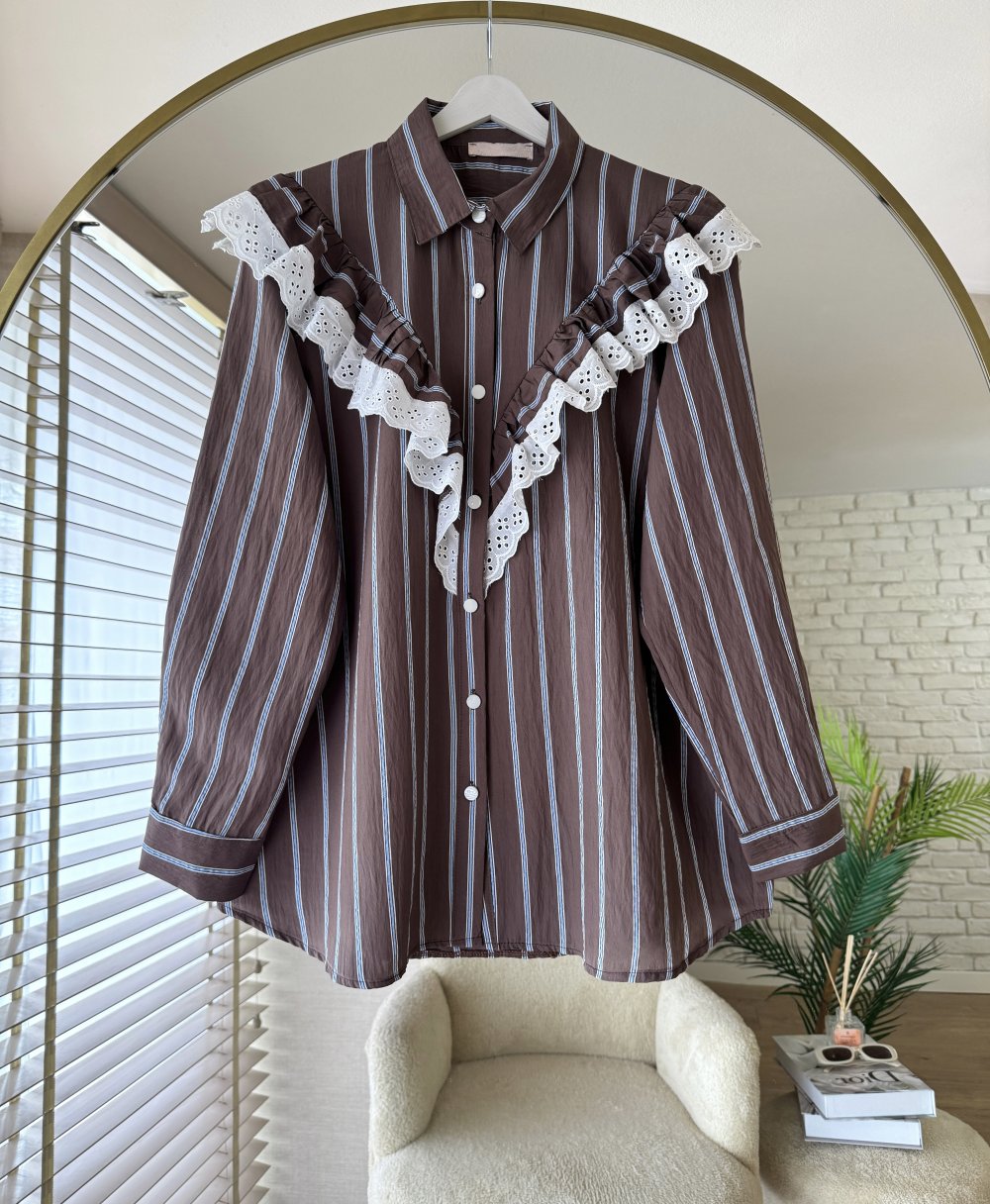 Çizgili Dantel Detaylı Gömlek Kahverengi