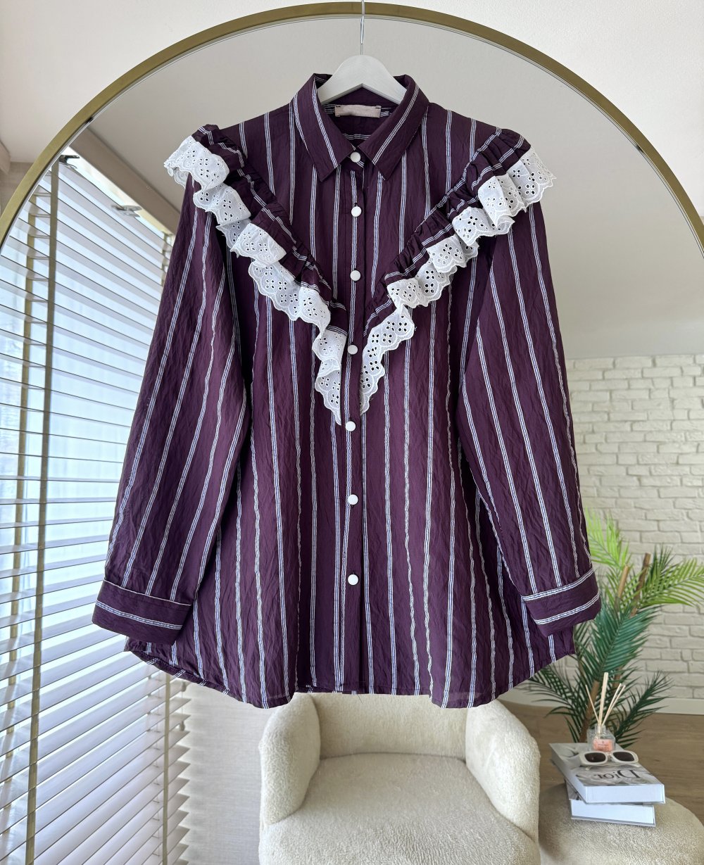 Çizgili Dantel Detaylı Gömlek Mürdüm