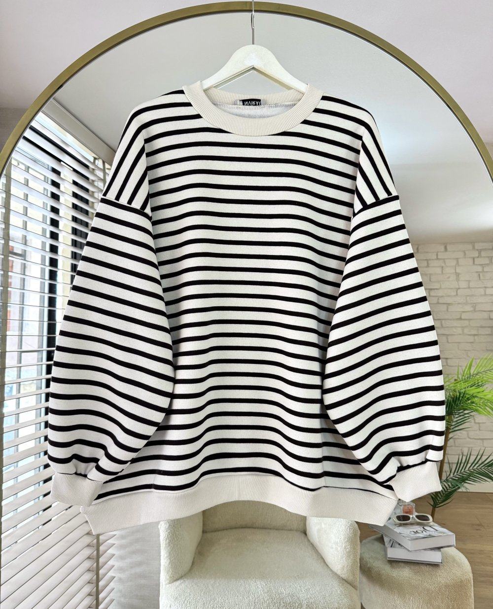 Çizgili Oversize Sweatshirt Koyu Kahverengi