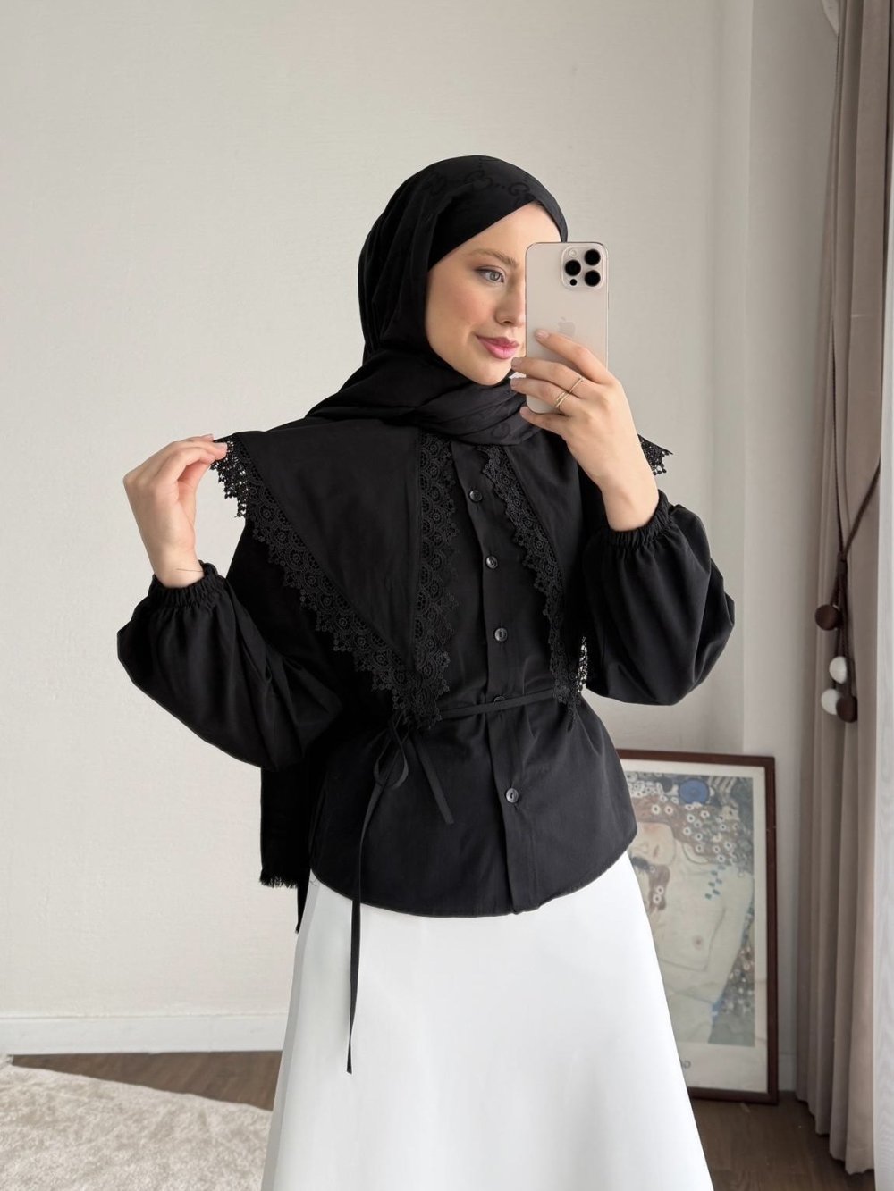 Dantel Yakalı Kısa Gömlek Siyah