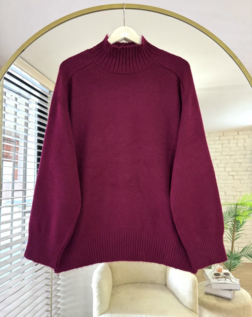 Dik Yaka Yırtmaçlı Oversize Kazak Bordo
