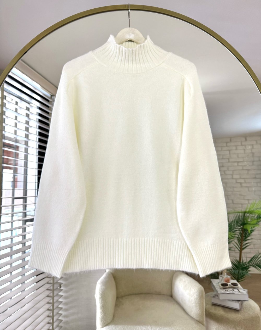 Dik Yaka Yırtmaçlı Oversize Kazak Ekru
