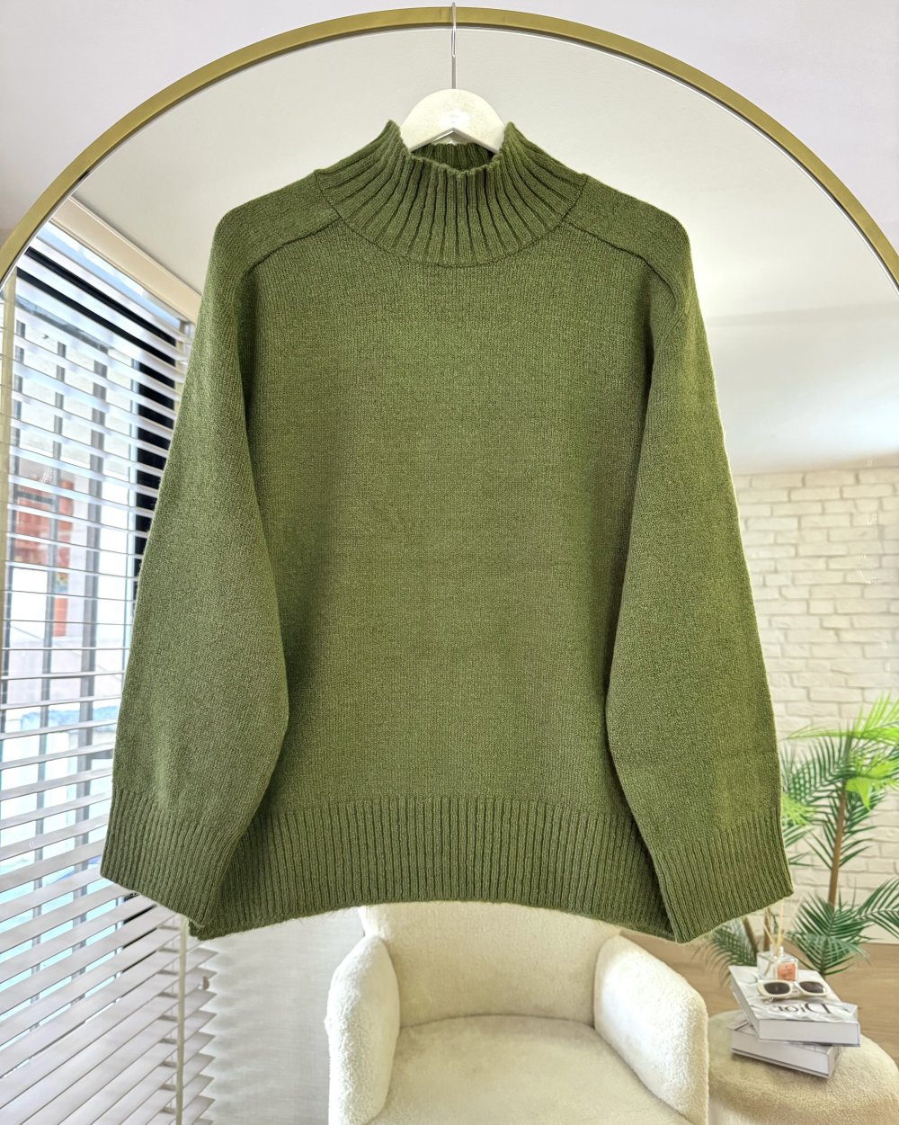 Dik Yaka Yırtmaçlı Oversize Kazak Haki