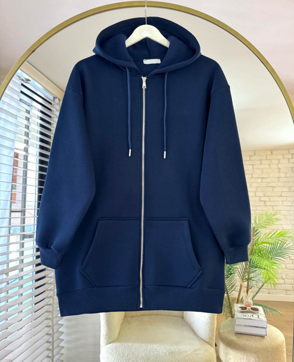 Fermuarlı Üç İplik Uzun Hırka Lacivert