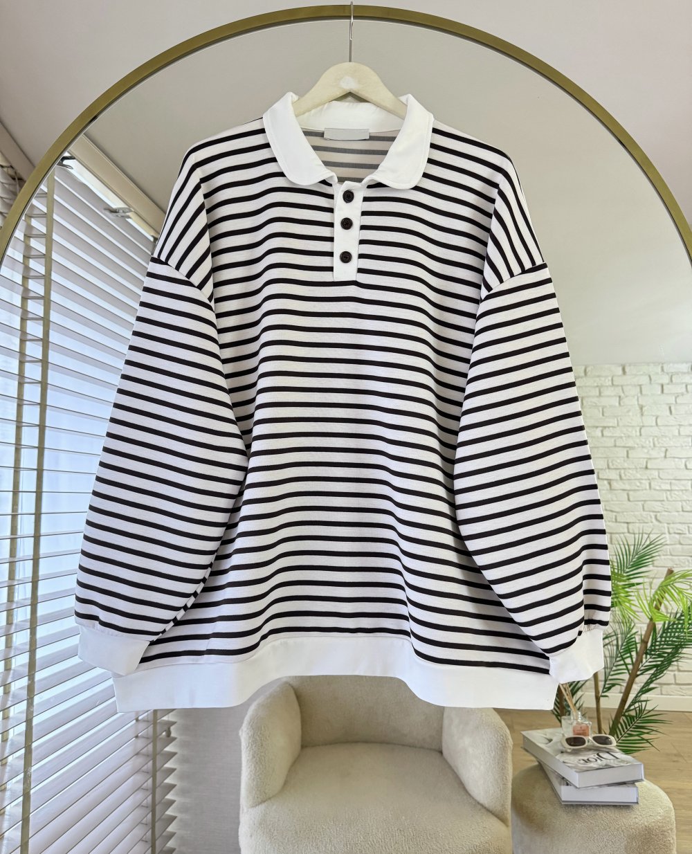 Gömlek Yaka Çizgili Salaş Sweatshirt Koyu Kahverengi