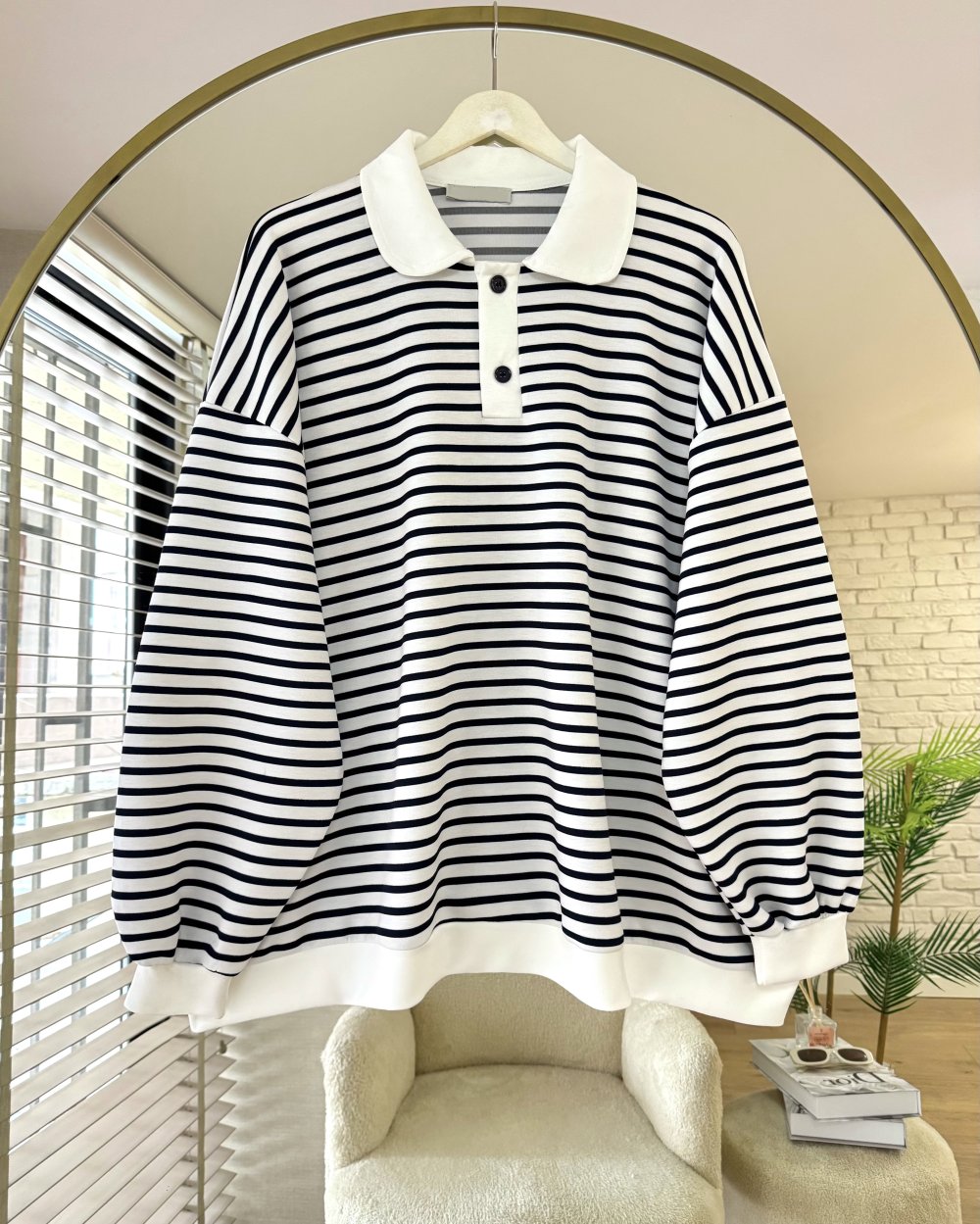 Gömlek Yaka Çizgili Salaş Sweatshirt Siyah
