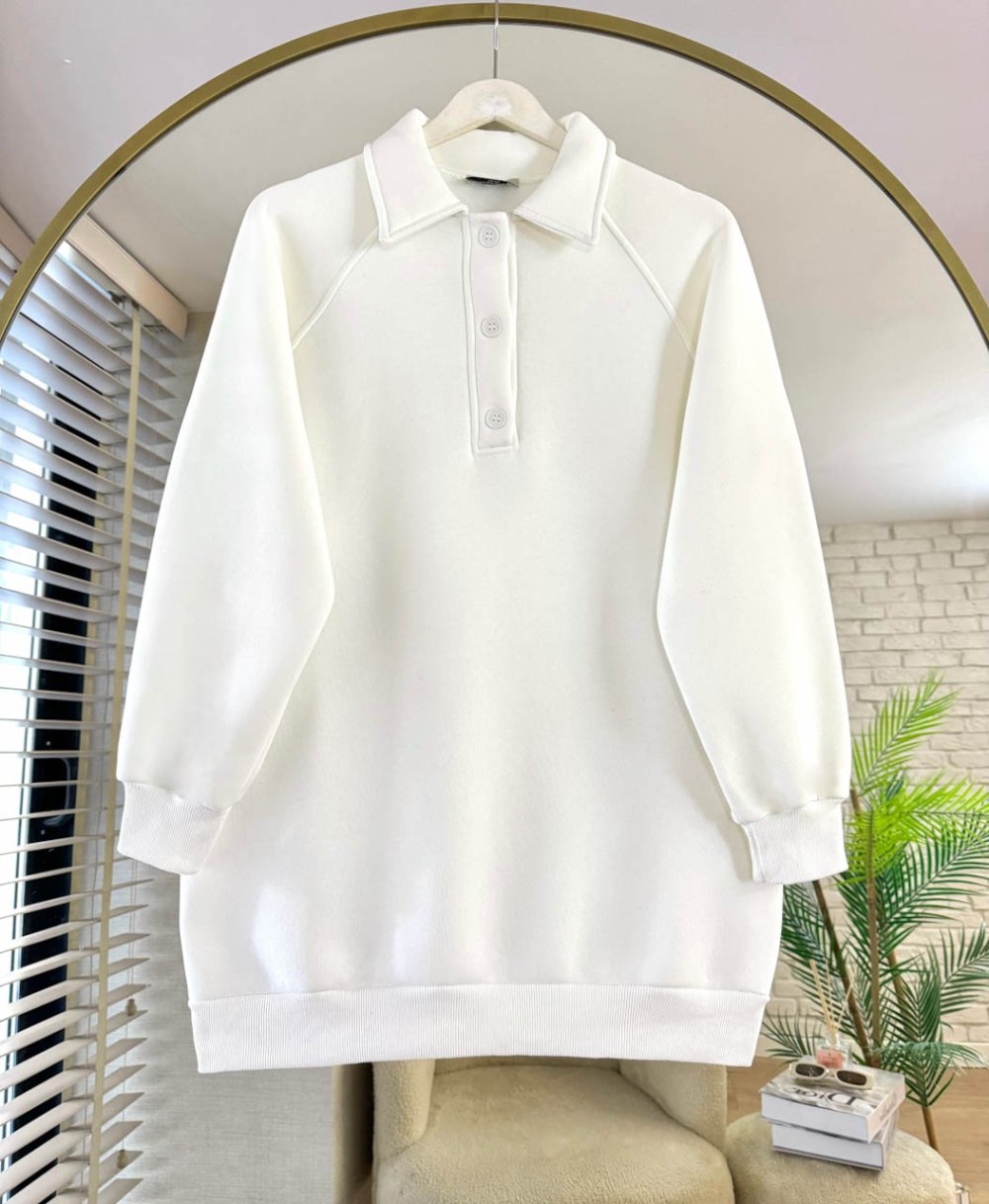 Gömlek Yaka Üç İplik Sweathirt Beyaz
