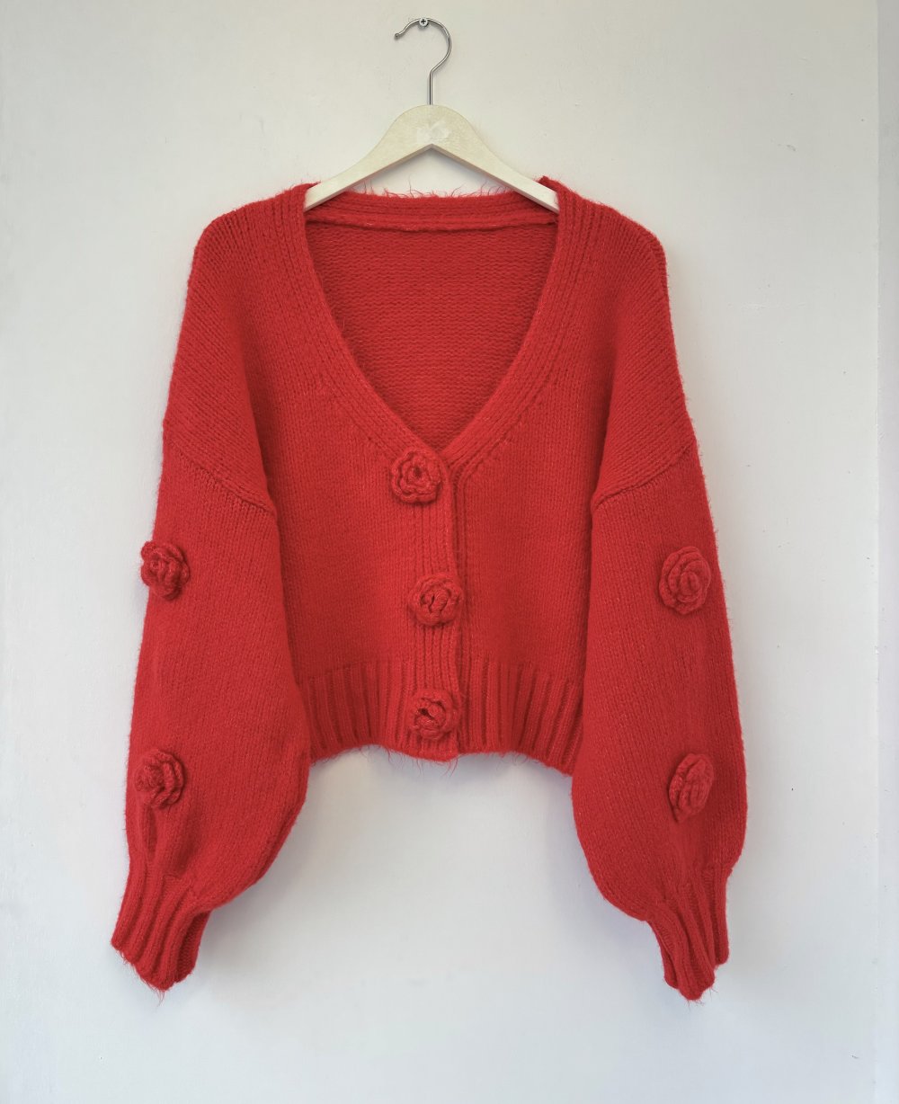 Gül Detaylı Çıt Çıtlı Hırka Nar Çiçeği