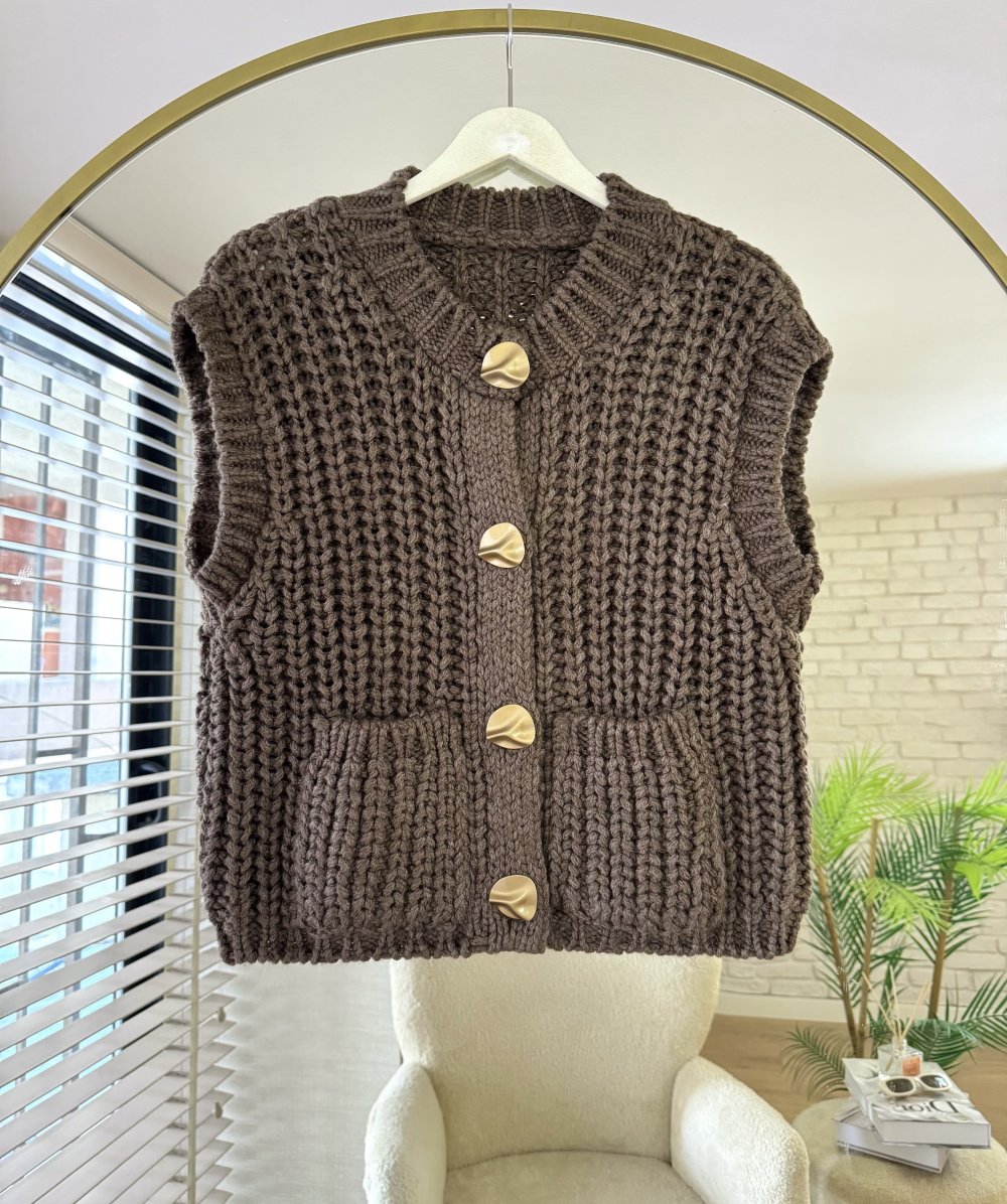 Kalın Örgü Cepli Yelek Acı Kahve