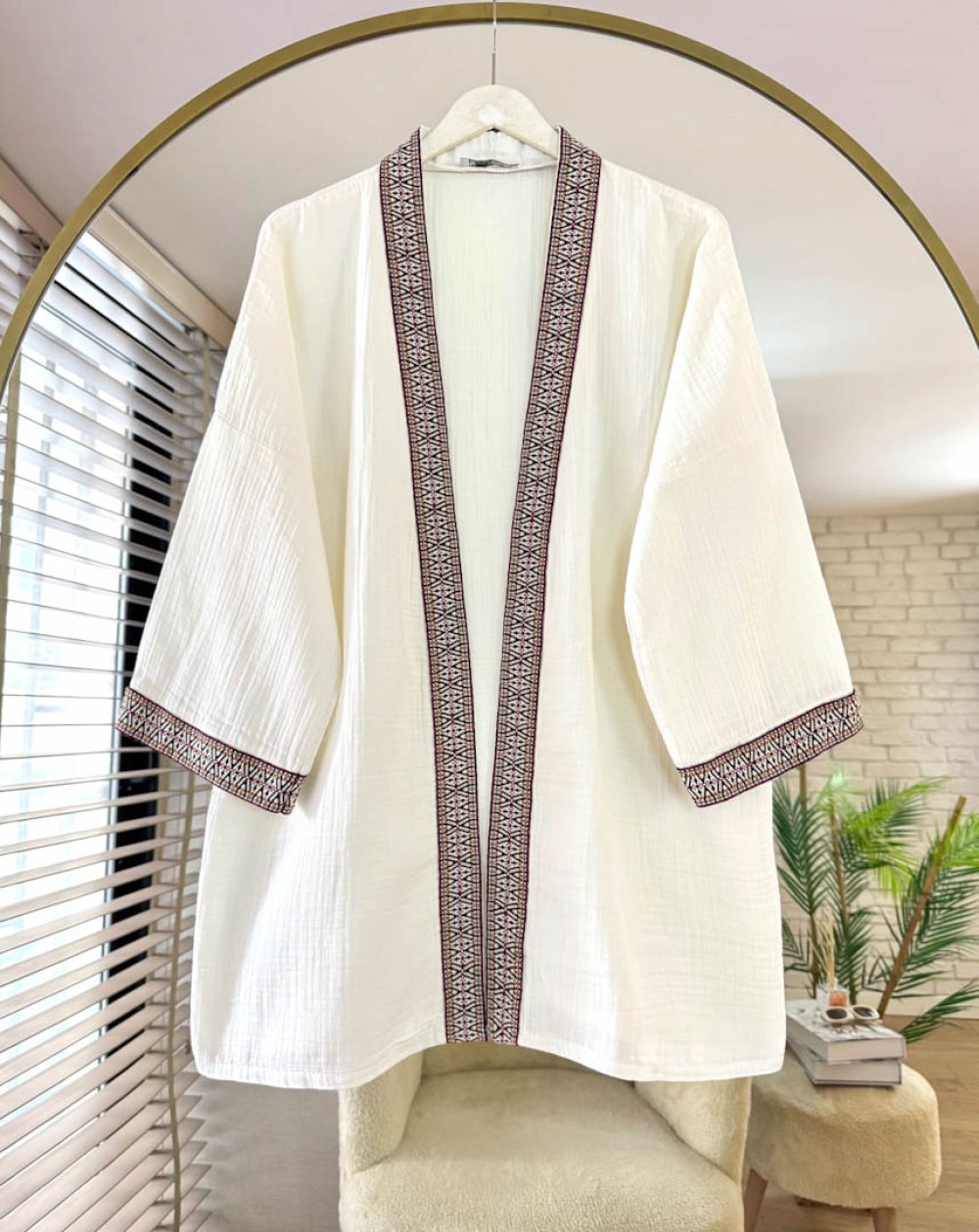 Kilim Şeritli Müslin Kimono Ekru