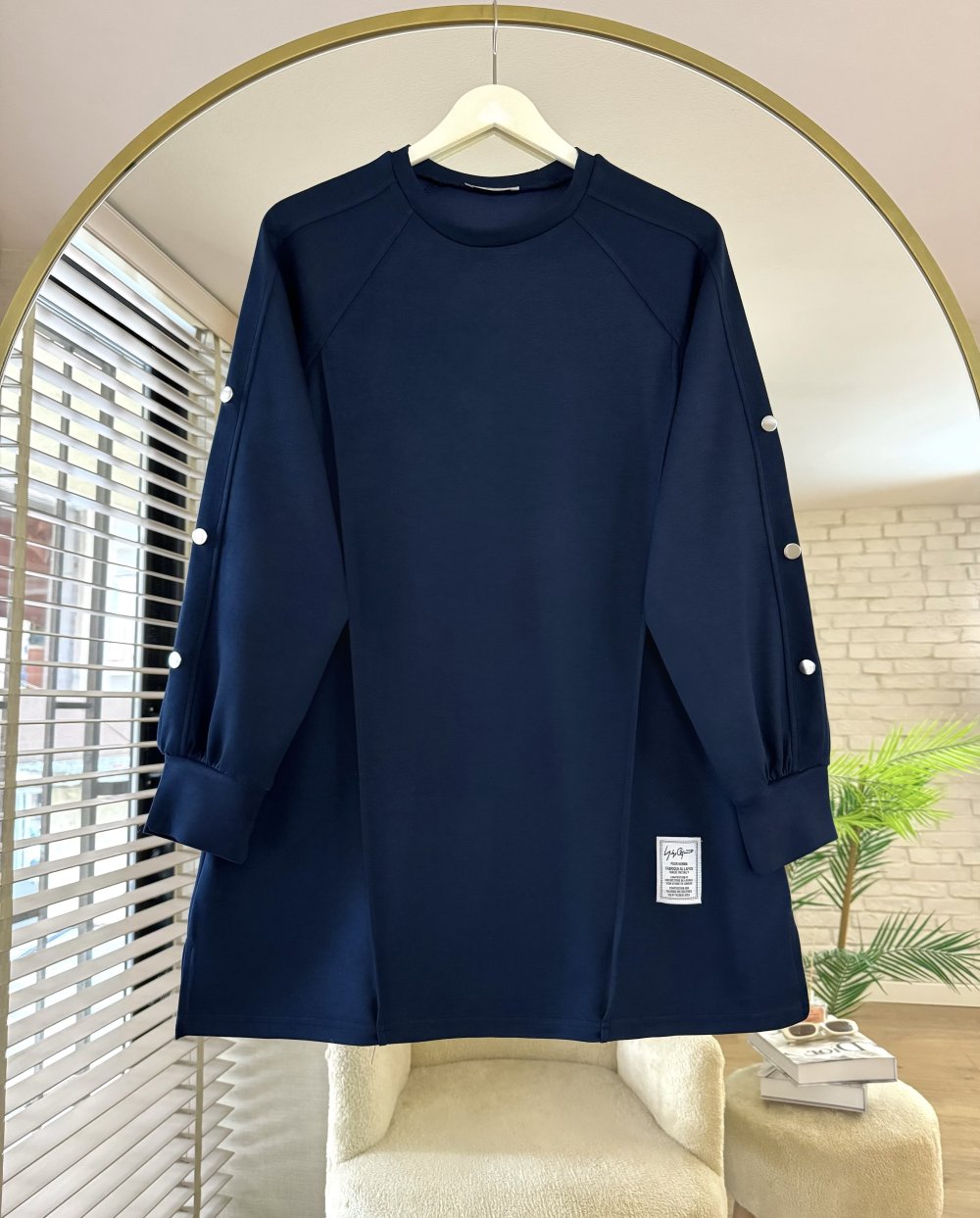 Kolları Düğme Detaylı Çımalı Tunik Lacivert