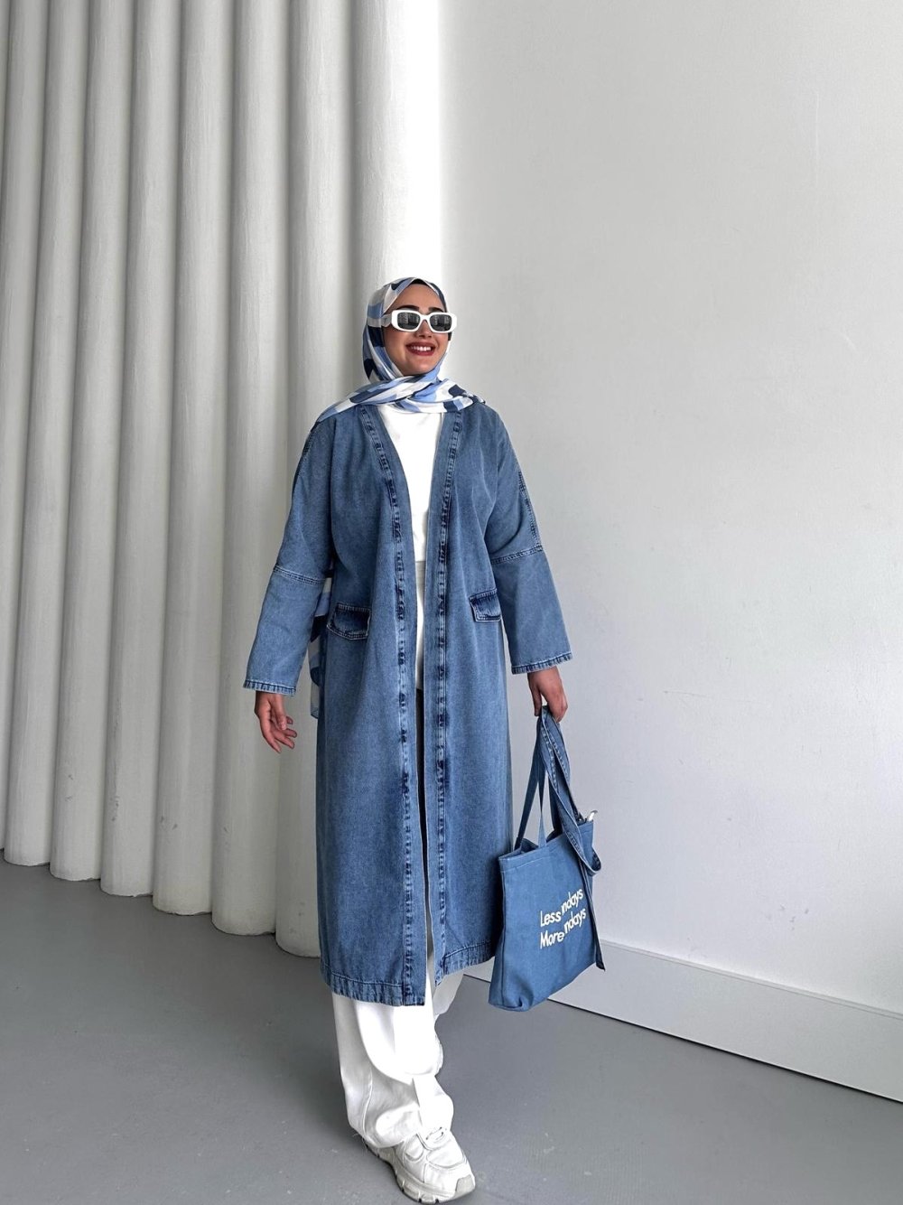 Kuşaklı Uzun Kot Ceket Mavi