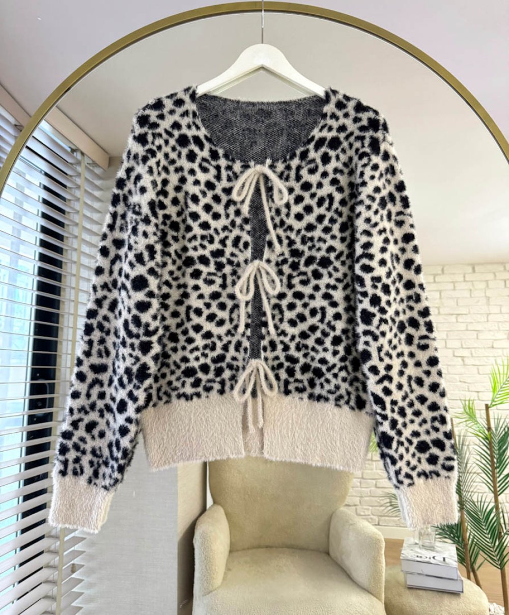 Leopar Desen Bağcıklı Yumoş Hırka Bej