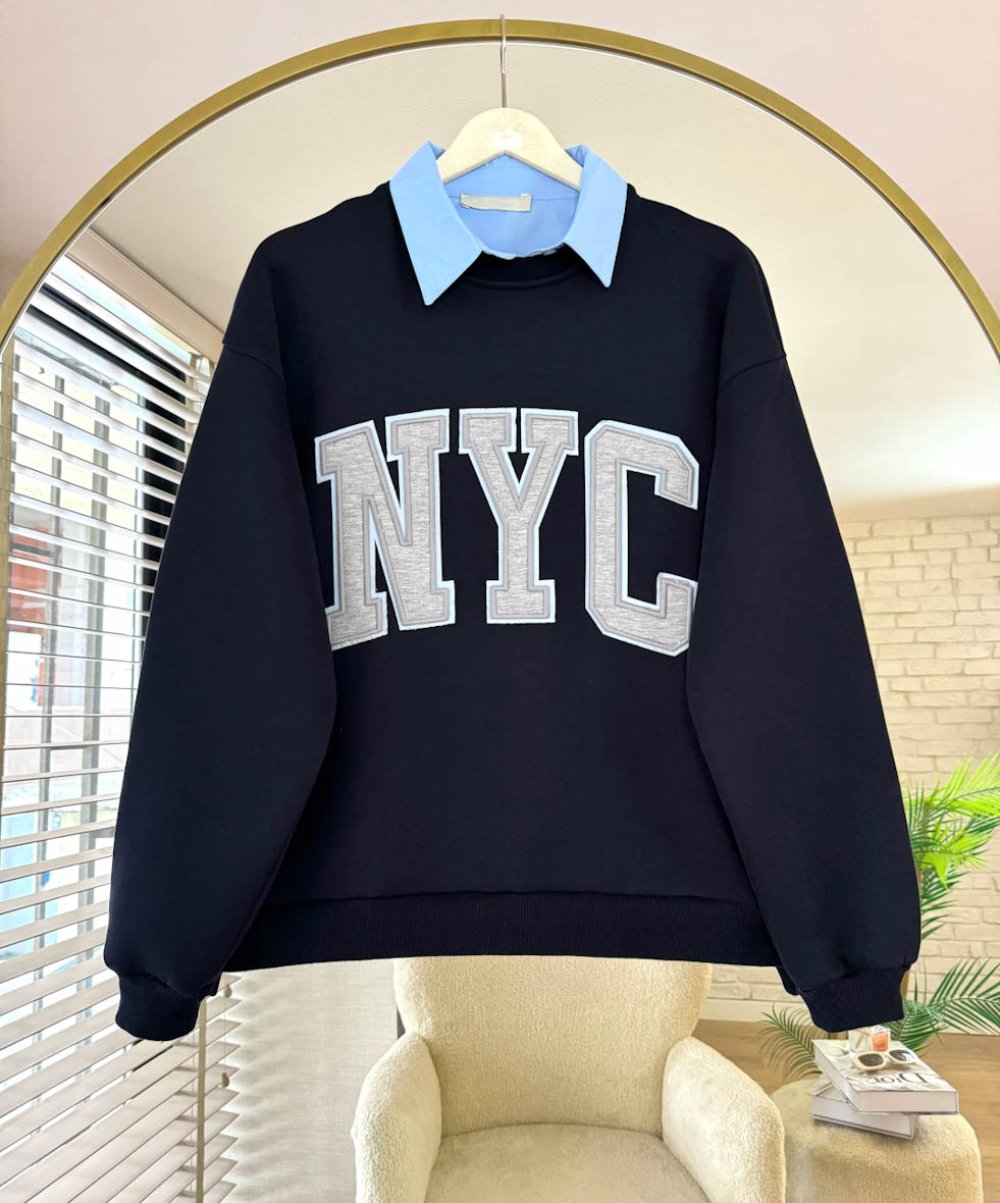 NYC Nakışlı Yakalı Üç İplik Sweatshirt Koyu Lacivert