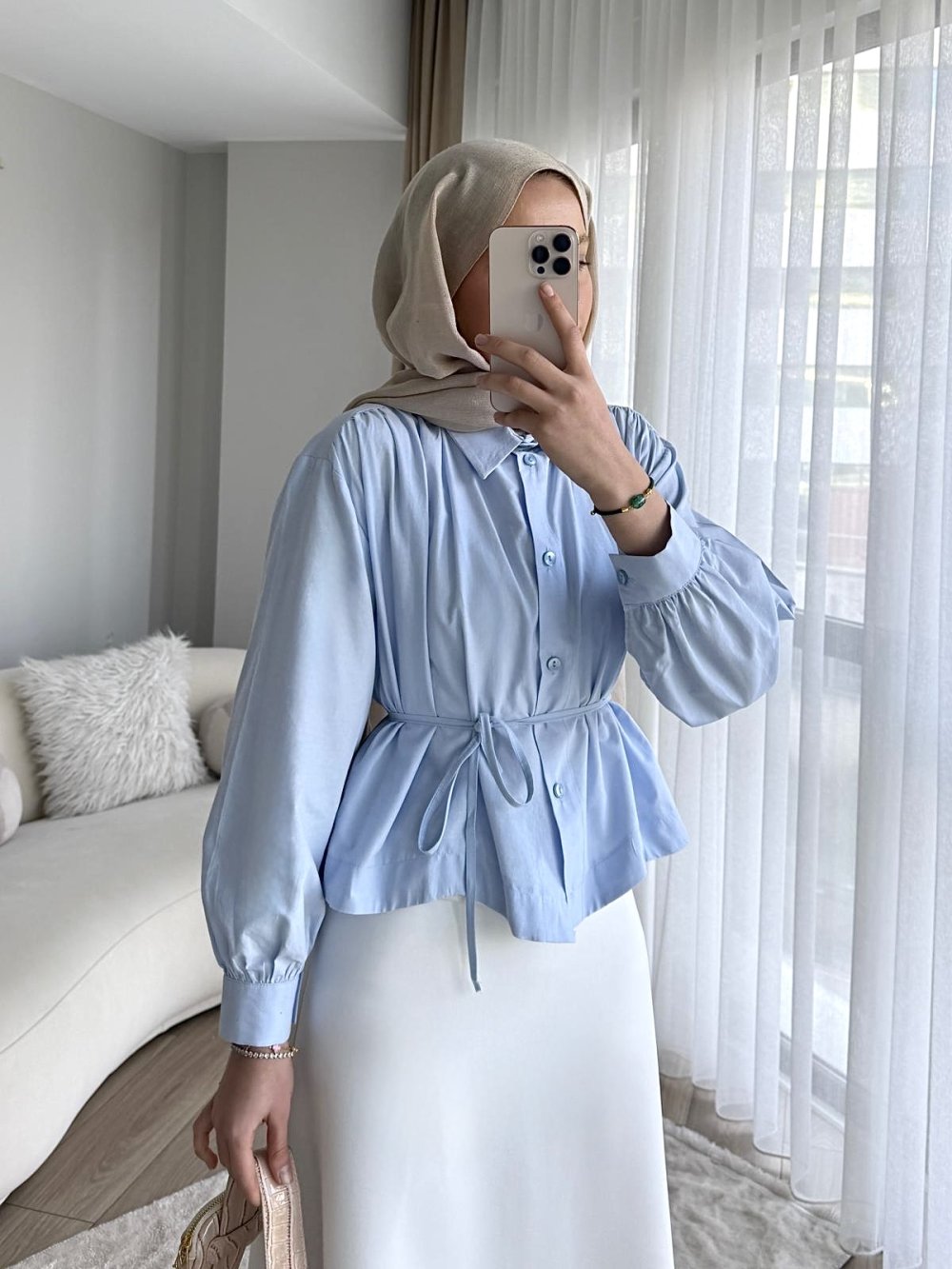 Omuzu Pileli Oversize Kısa Gömlek Bebe Mavisi