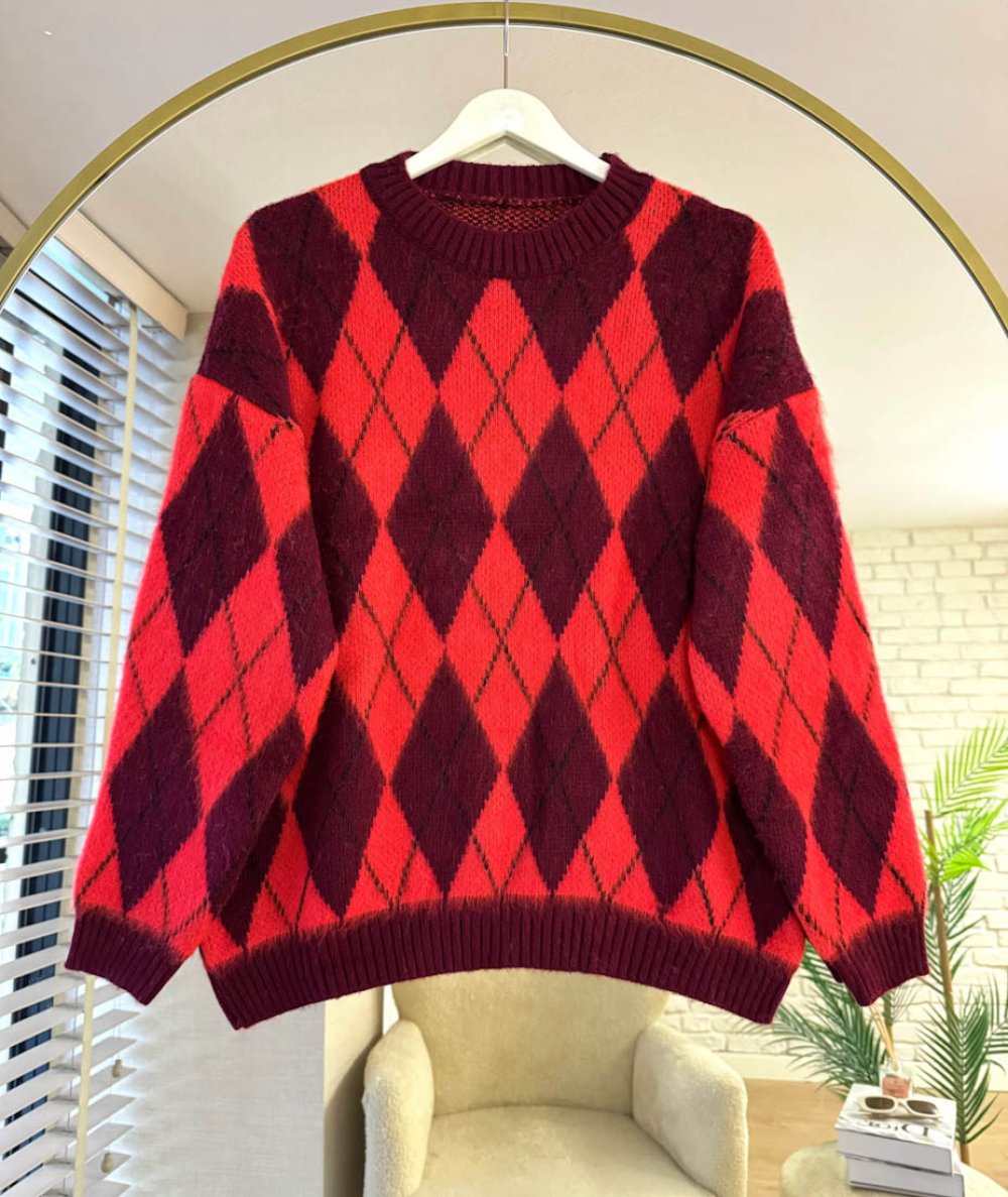 Oversize Baklava Desenli Kazak Nar çiçeği Bordo