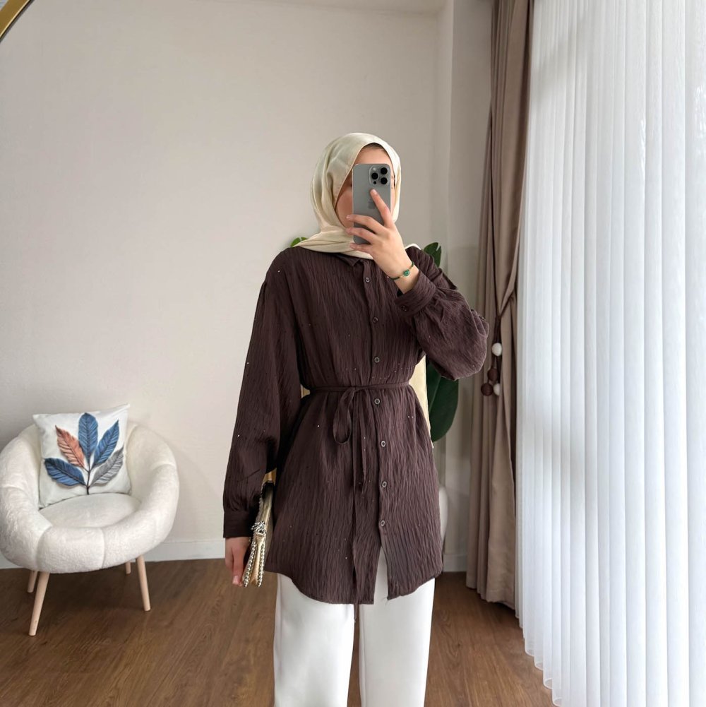 Pul İşlemeli Armürlü Gömlek Koyu Kahverengi