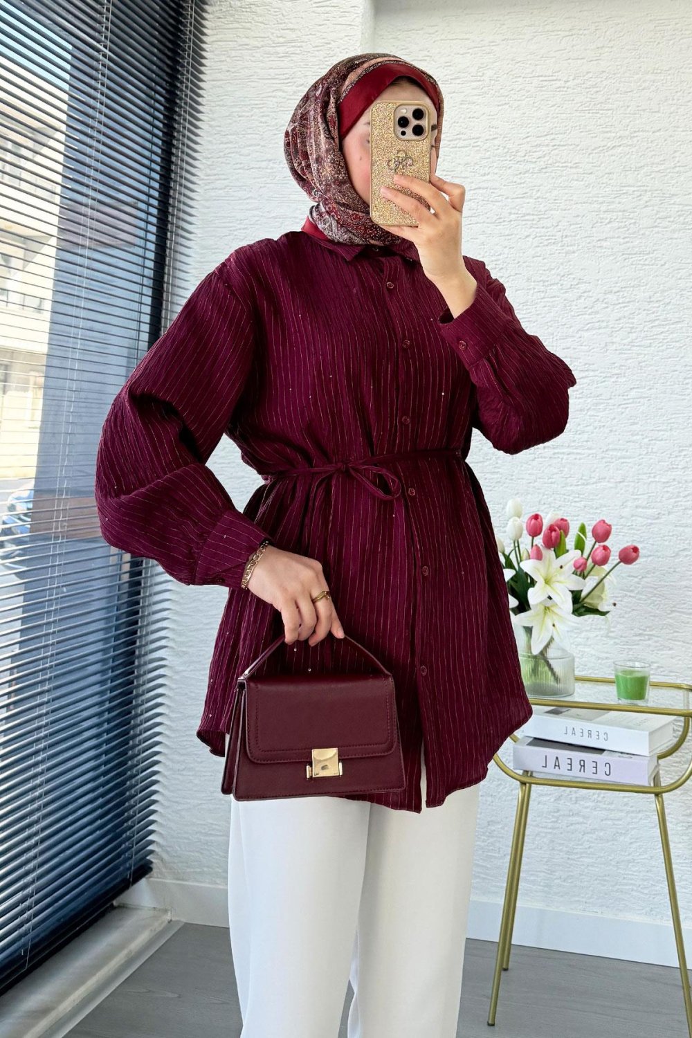 Pul İşlemeli Armürlü Gömlek Bordo