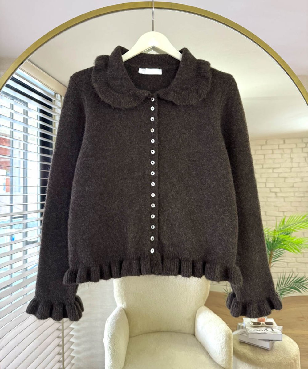 Sedef Düğmeli Fırfırlı Hırka Kahverengi