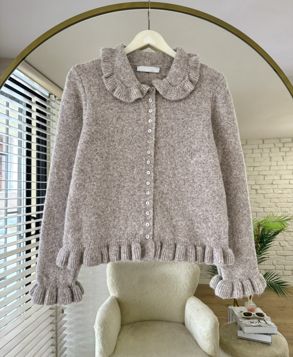 Sedef Düğmeli Fırfırlı Hırka Vizon