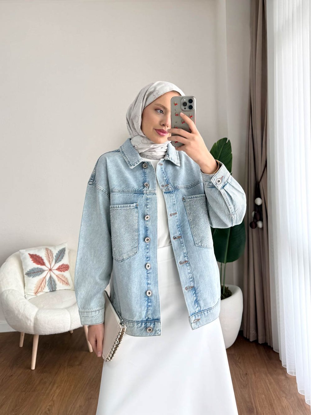 Taş Detaylı Oversize Kot Ceket Kar Yıkama Mavi