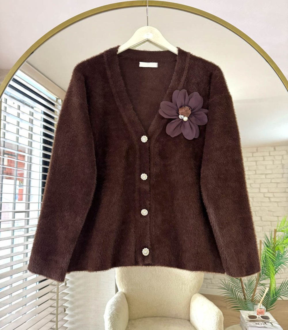 Taş Düğmeli Çiçekli Hırka Acı Kahve