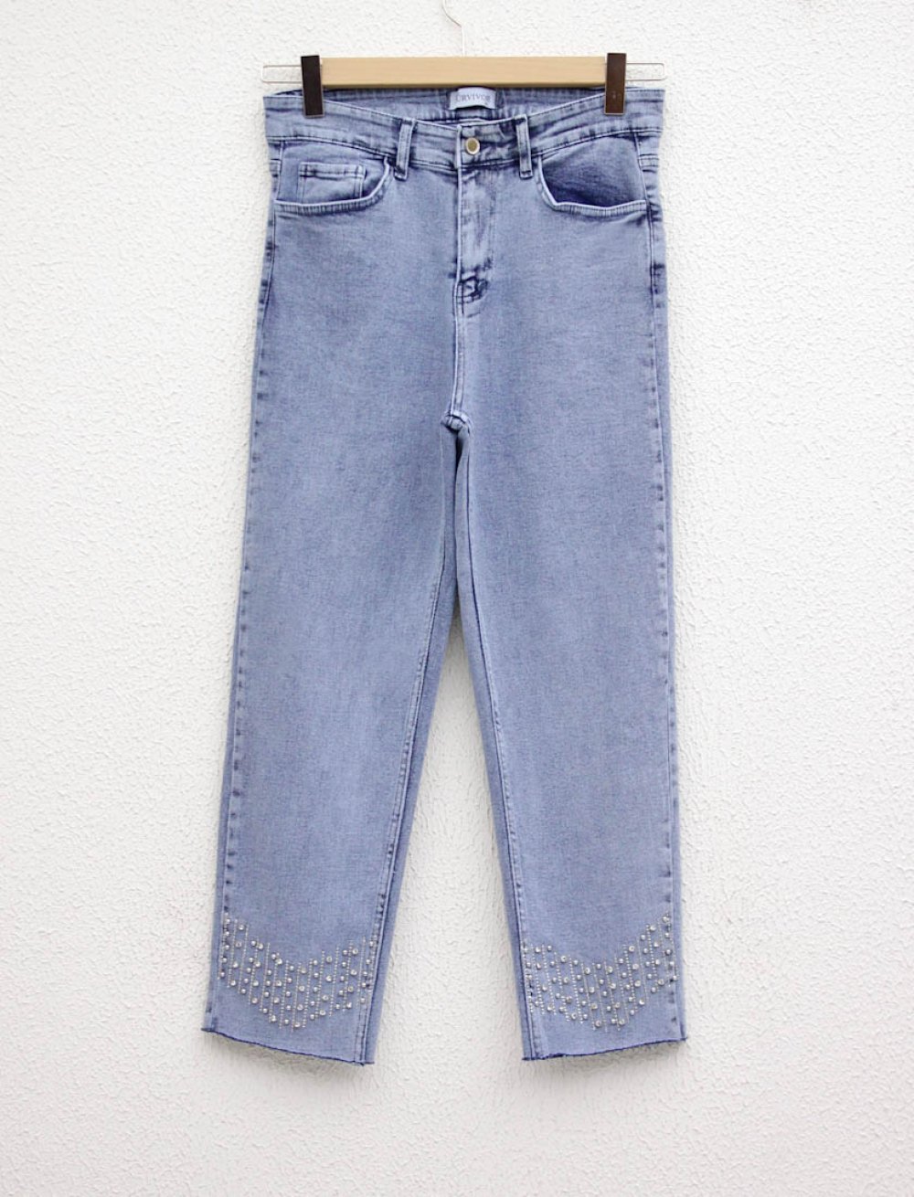 Taş İşlemeli Kesik Paça Pantolon Kar Yıkama Mavi