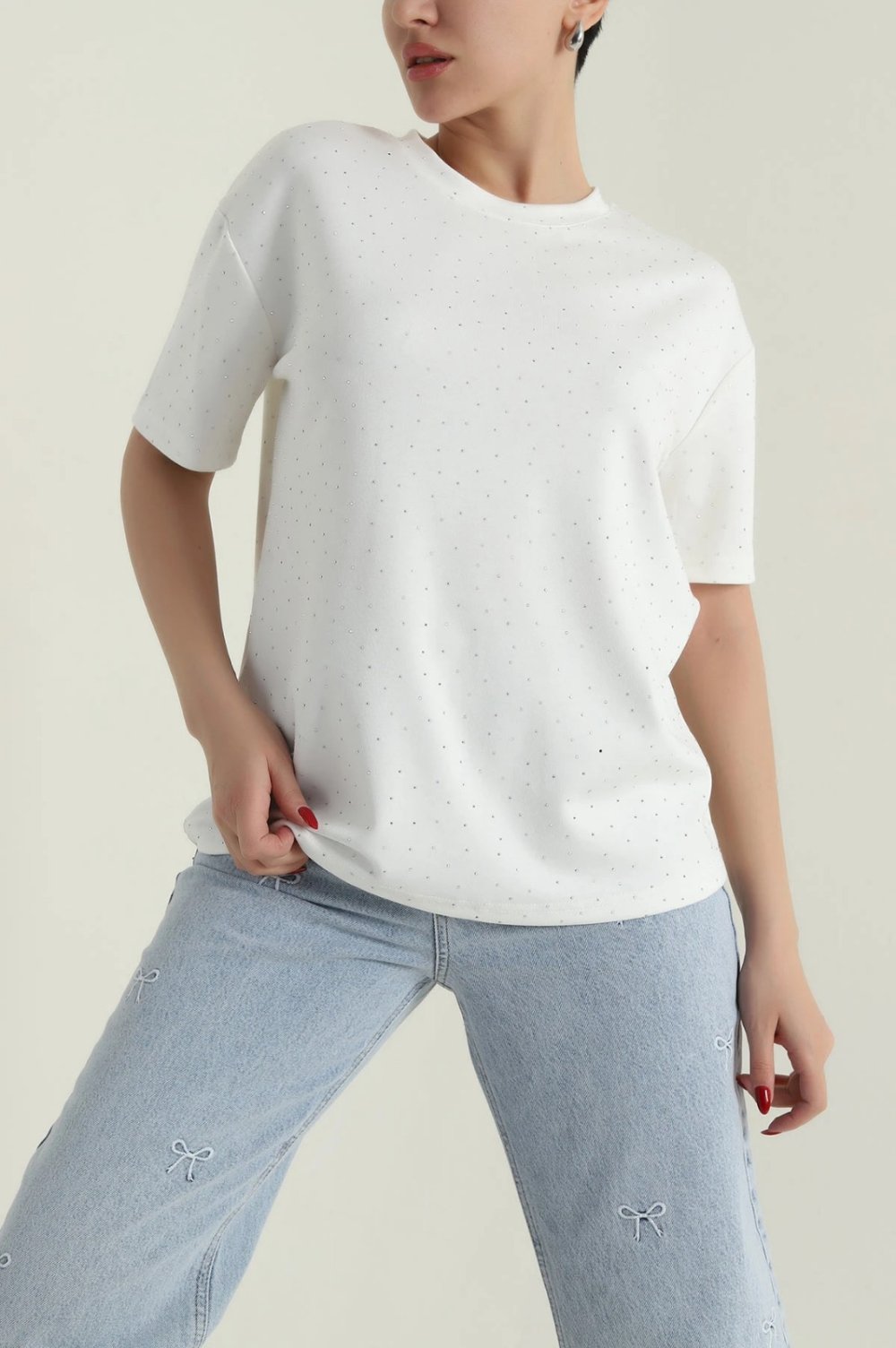 Taşlı Modal Tişört Beyaz