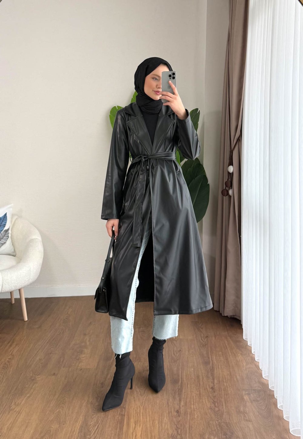 Tek Düğmeli Uzun Deri Trençkot Siyah