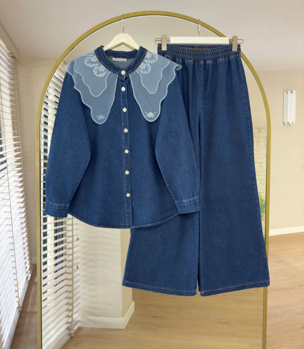 Tül Yakalı Kot Takım Kot Mavisi