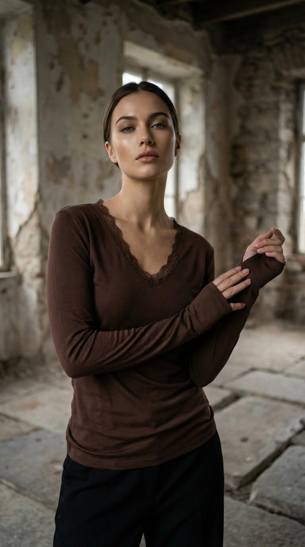 V Yaka Dantelli Body Acı Kahve