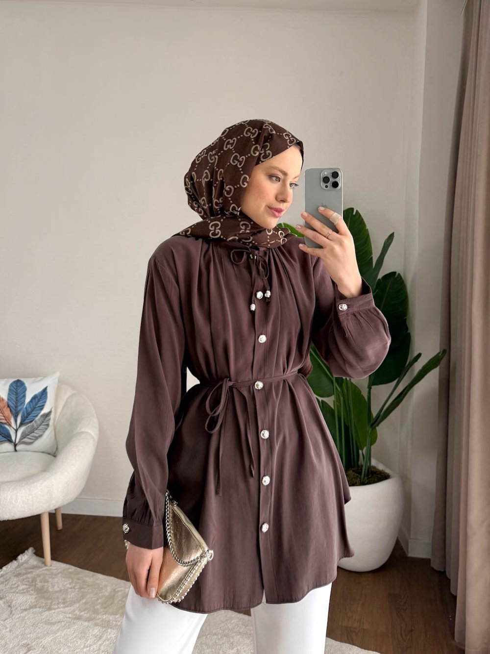 Yaka Bağcıklı Salaş Tunik Kahverengi