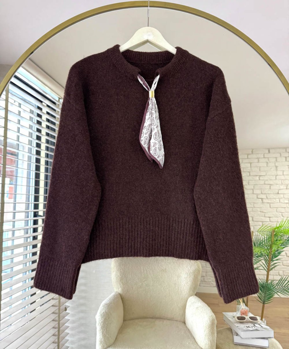 Yakası Fularlı Kazak Acı Kahve