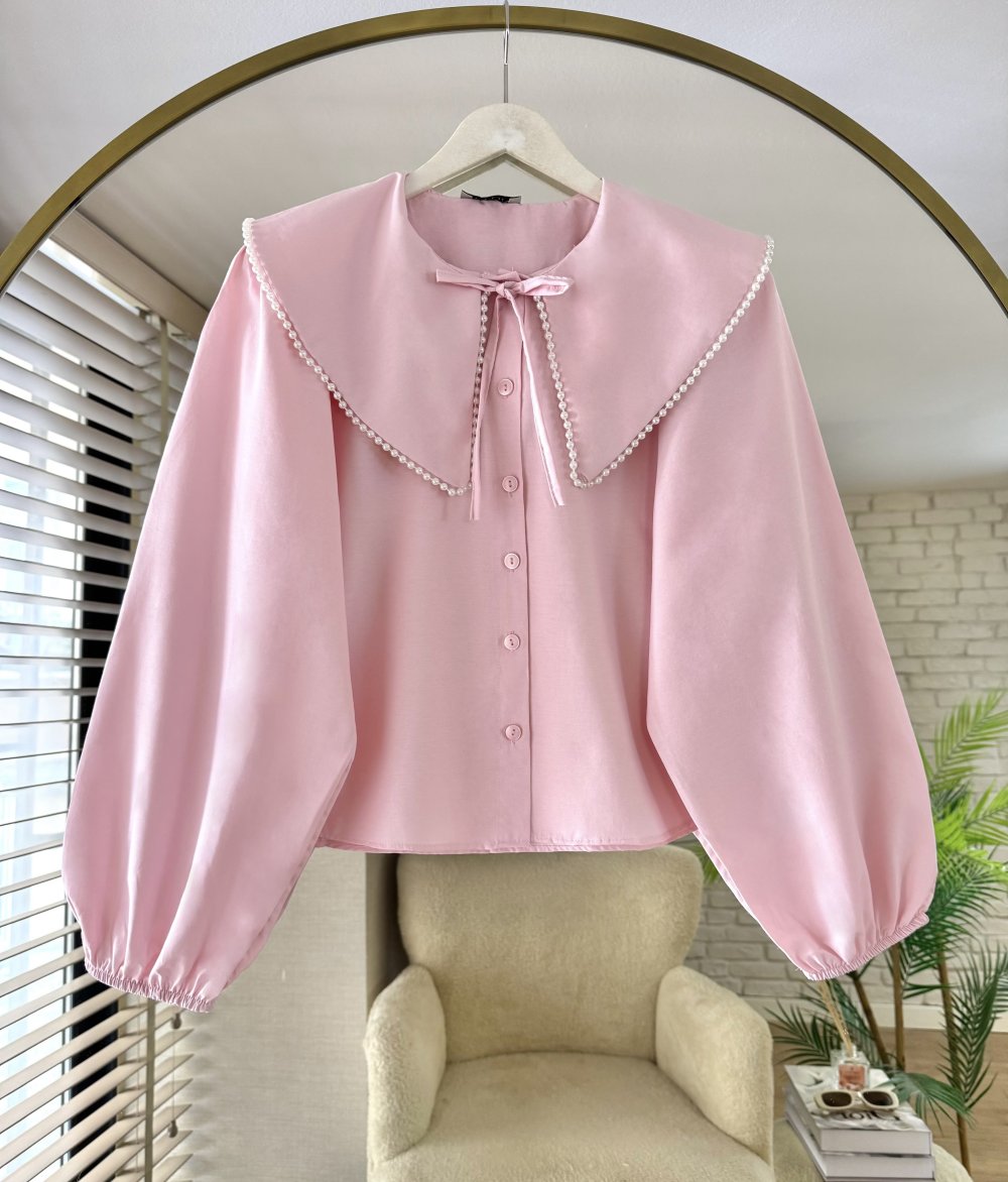 Yakası İncili Bluz Pudra