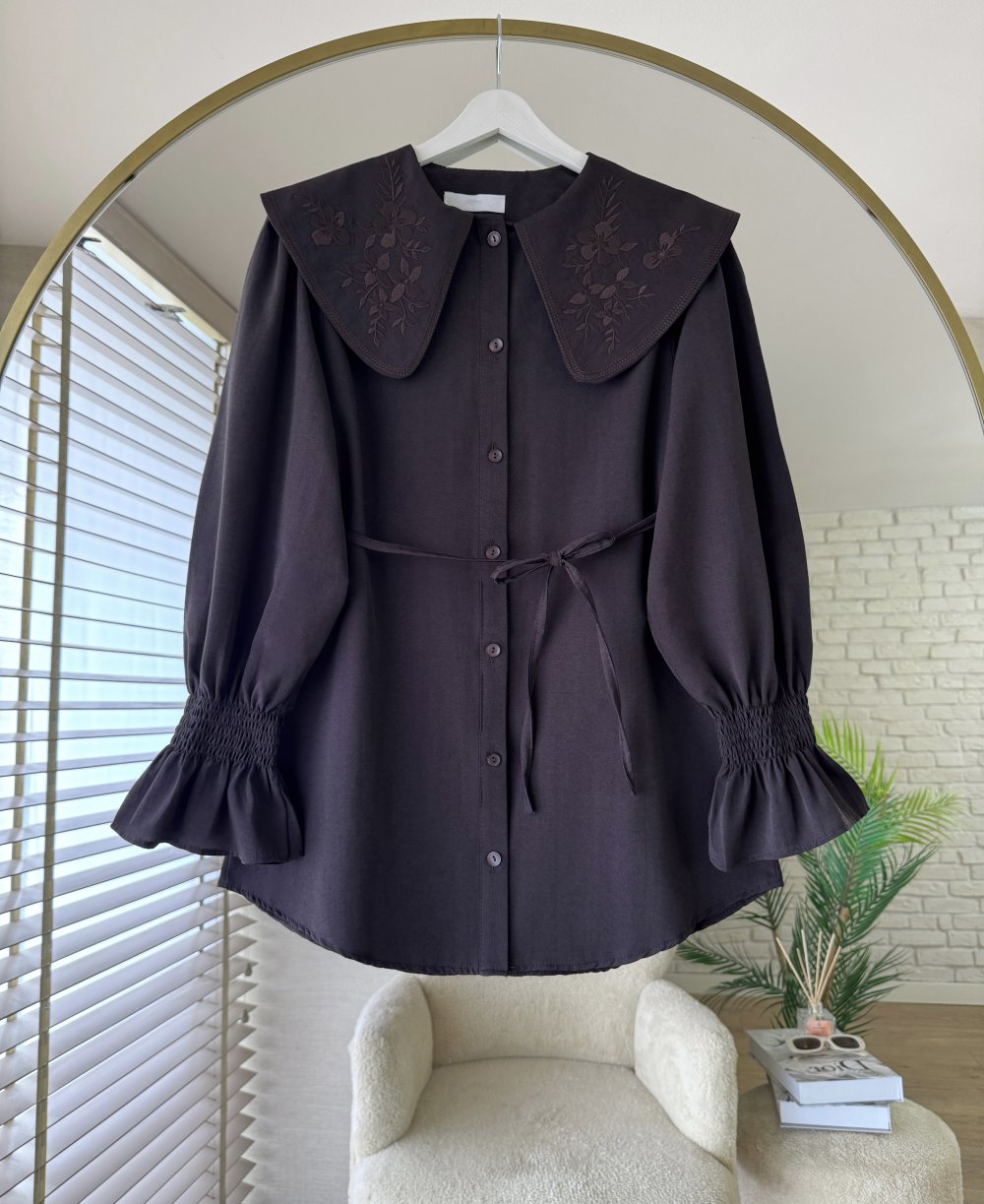 Yakası Nakışlı Gömlek Acı Kahve