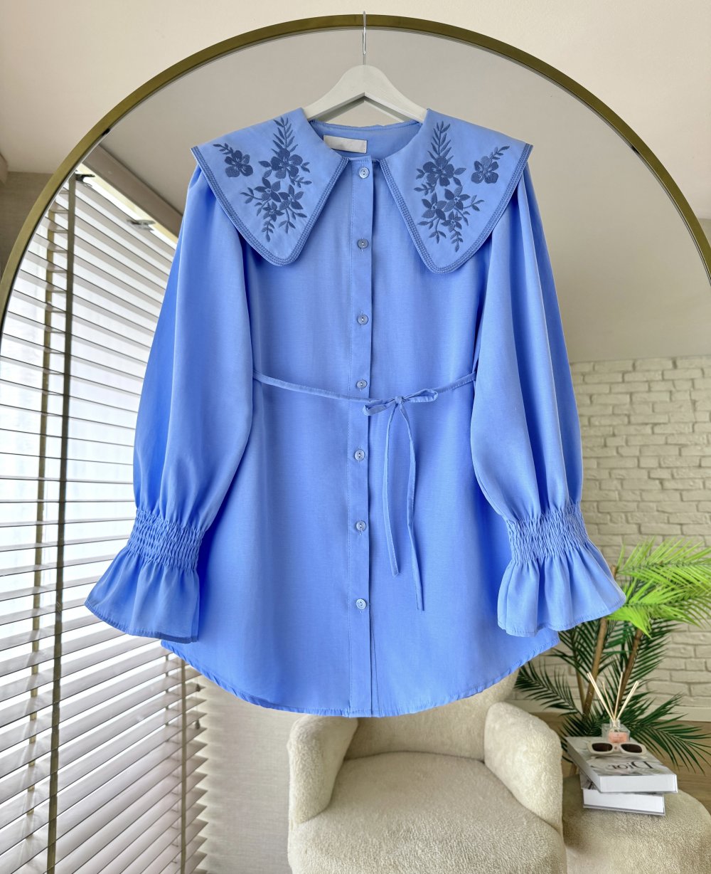 Yakası Nakışlı Gömlek Mavi