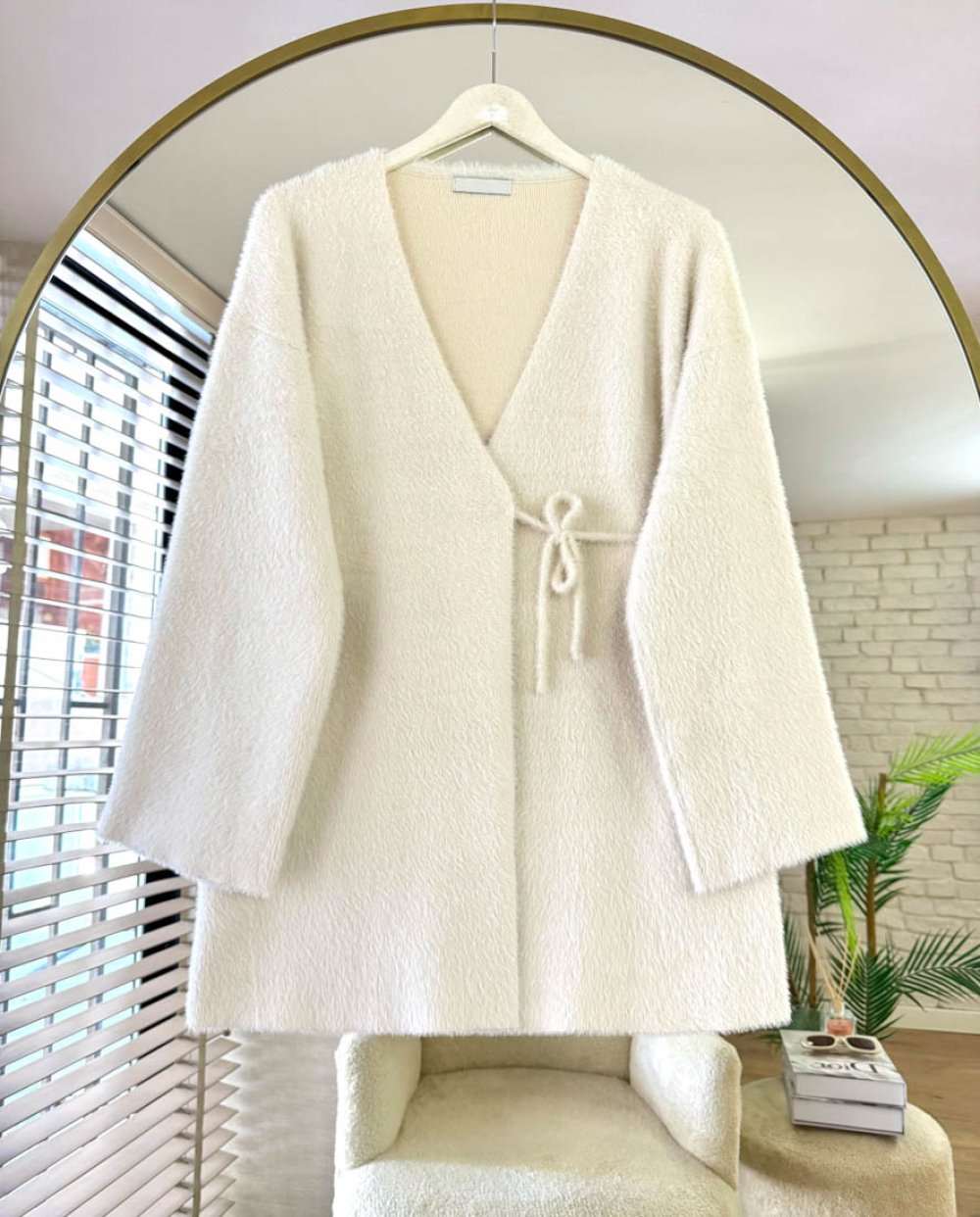 Yandan Bağcıklı Sakallı Triko Hırka Krem