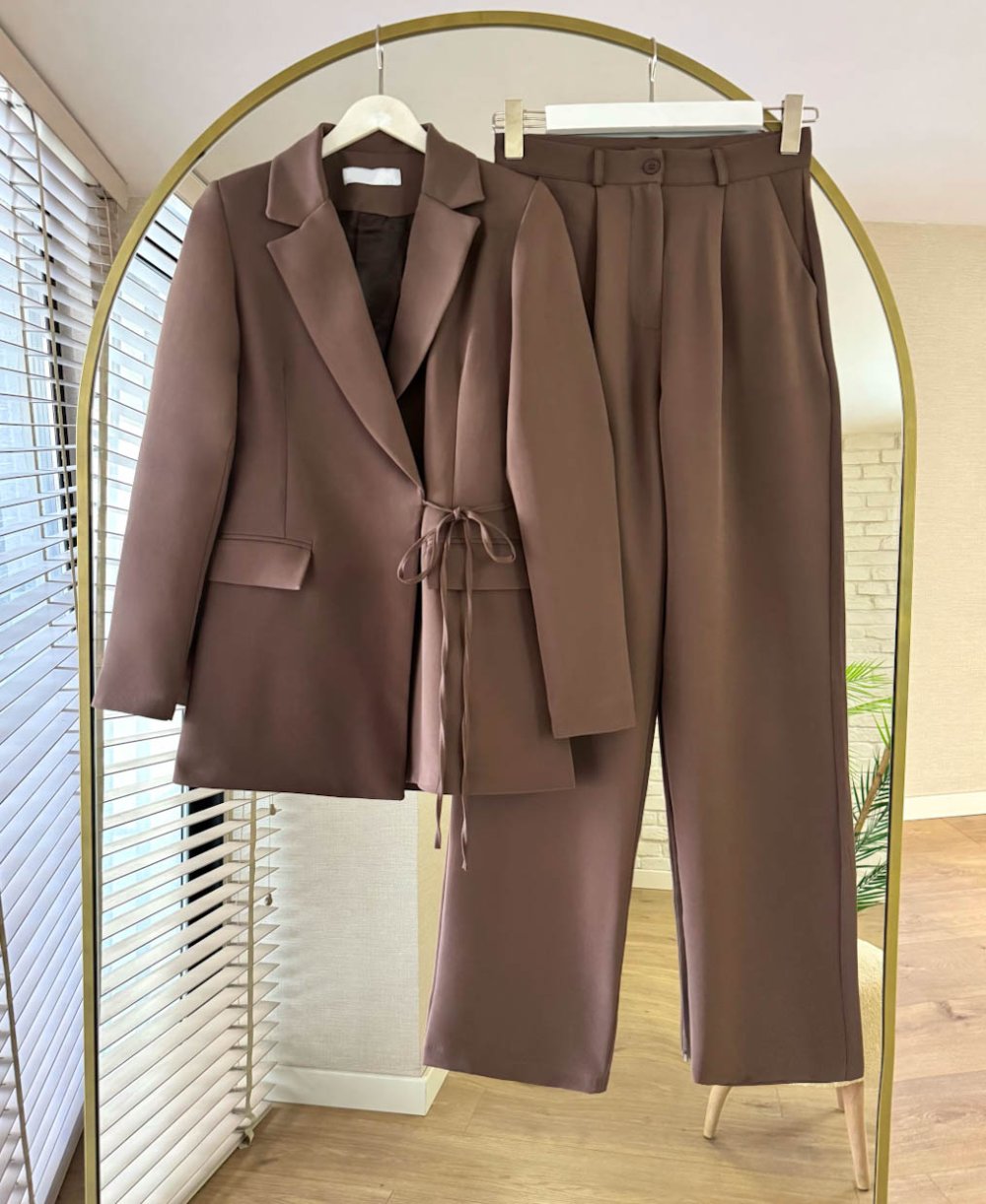 Yandan Bağlamalı Ceketli Takım Kahverengi