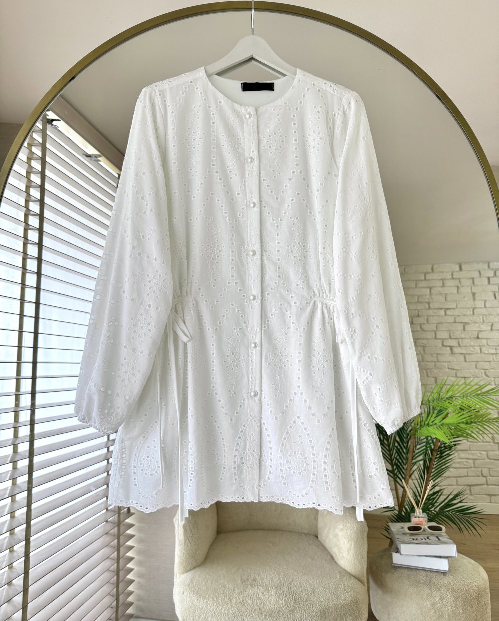 Yanları Bağcıklı Brode Tunik Beyaz