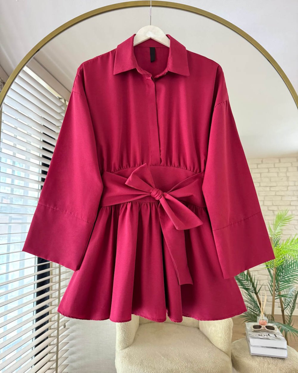 Yarım Patlı Beli Kuşaklı Gömlek Bordo